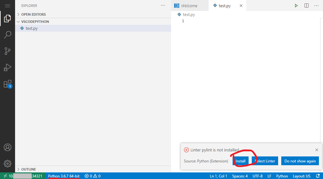 왼쪽 아래에 python 버전이 나오는지 확인해야 한다.