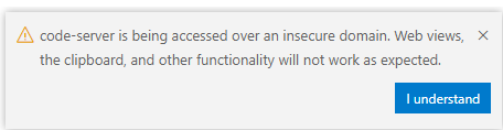 오른쪽 아래에 이런 경고메세지가 나오는데 이를 해결하는 간단한 편법이 있다. (단순히 경고메세지가 아니라 클립보드 사용불가 및 다른 플러그인이 동작하지 않아 code-server를 사용하는데 어려움이 있을 수 있다. 개의치 않다면 넘어가도 괜찮다.)