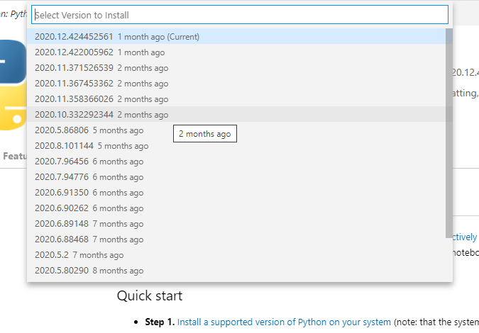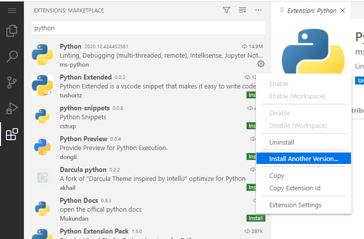 최신버전의 python 확장팩은 code-server와 호환이 잘 안되는 경우가 많다. 따라서 설치 후 이전 버전으로 다시 설치해주어야 한다.